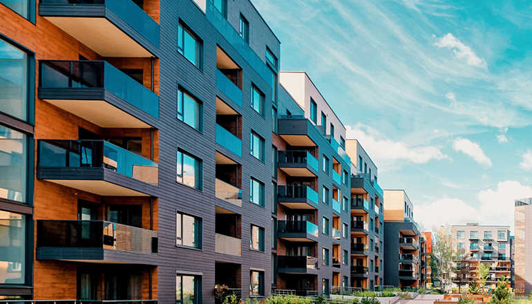 The gracious entry foyer leads to an open kitchen with custom stained walnut cabinetry, granite countertops, and a built-in dining banquette (in select one bedroom homes.